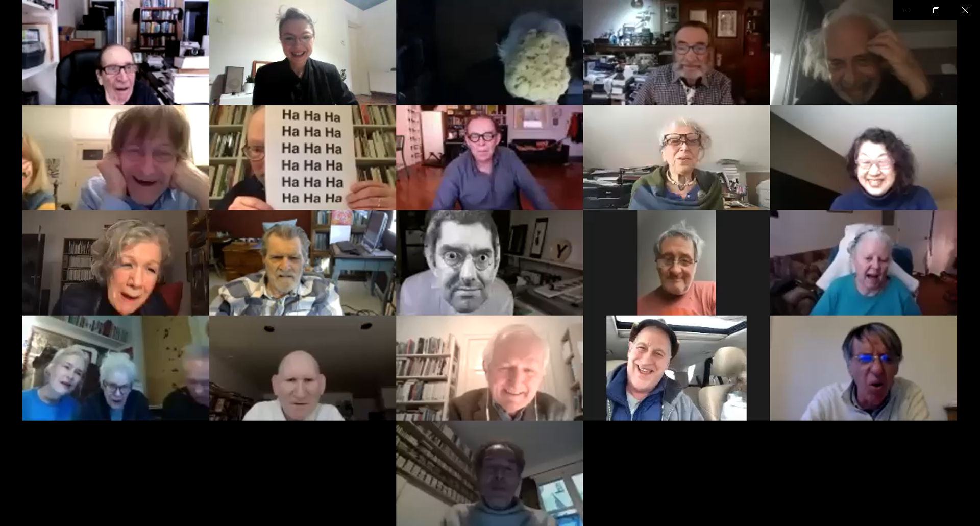 Maciunas Laughter (Fluxus Edition), performance online on Zoom, 2021 (performers: Eric Andersen, Alain Arias-Misson, Jeff Berner, Jacques Donguy, Charles Doria, Charles Dreyfus Pechkoff, Bartolomé Ferrando, Peter Frank, Ken Friedman, Coco Gordon, John Halpern, Kevin Harrison, Jessica Higgins, Bengt af Klintberg, Jarosław Kozłowski, Alison Knowles, Bob Lens, Patrice Lerochereuil, Billie Maciunas, Ann Noel, Jeffrey Perkins, Norie Sato, Joshua Selman, Wim T. Shippers, Weronika Trojańska, Frank Trowbridge)